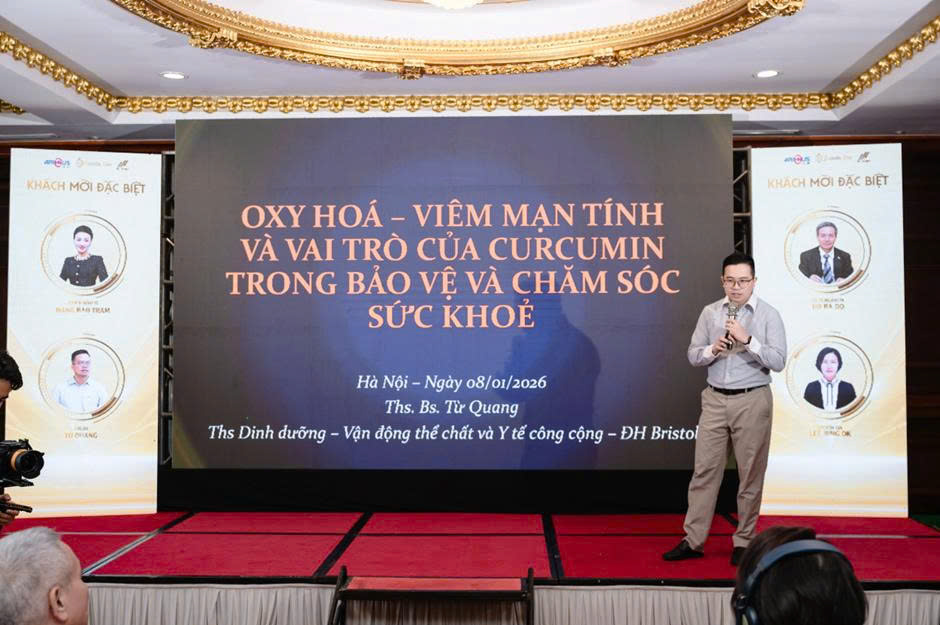 Mở đầu hội thảo, Thạc sĩ, Bác sĩ Từ Quang đã trình bày tham luận phân tích vai trò chống oxy hóa và chống viêm của Curcumin. Theo ông, nhiều vấn đề sức khỏe trong xã hội hiện đại xuất phát từ những rối loạn âm thầm trong cơ thể, đặc biệt là phản ứng viêm kéo dài và quá trình oxy hóa.